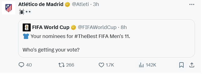 俱乐部在官方社交媒体上转发了国际足联公布的名单,并配上了两个表情符号——一只蜘蛛(阿尔瓦雷斯的昵称为小蜘蛛)和一双瞪大的眼睛,含蓄却有力地传达了他们的质疑。