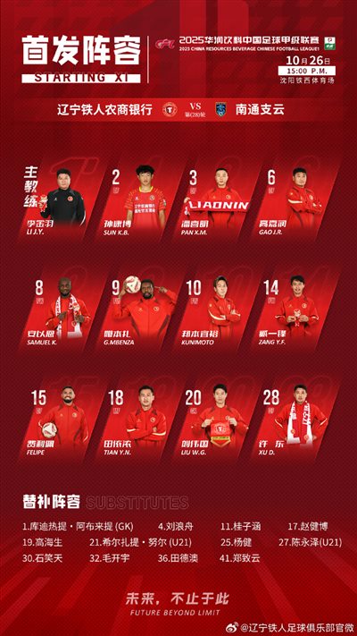 6686体育app10月26日讯 中甲联赛事第28轮,辽宁铁人主队场迎战南通支云,赛前双方首发出炉。