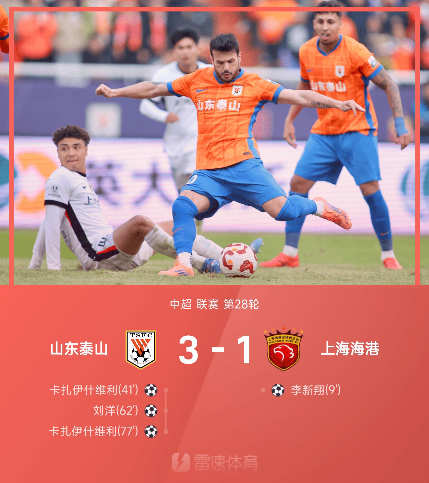 中超战报:卡扎双响,莱昂纳多伤退,泰山3-1逆转海港