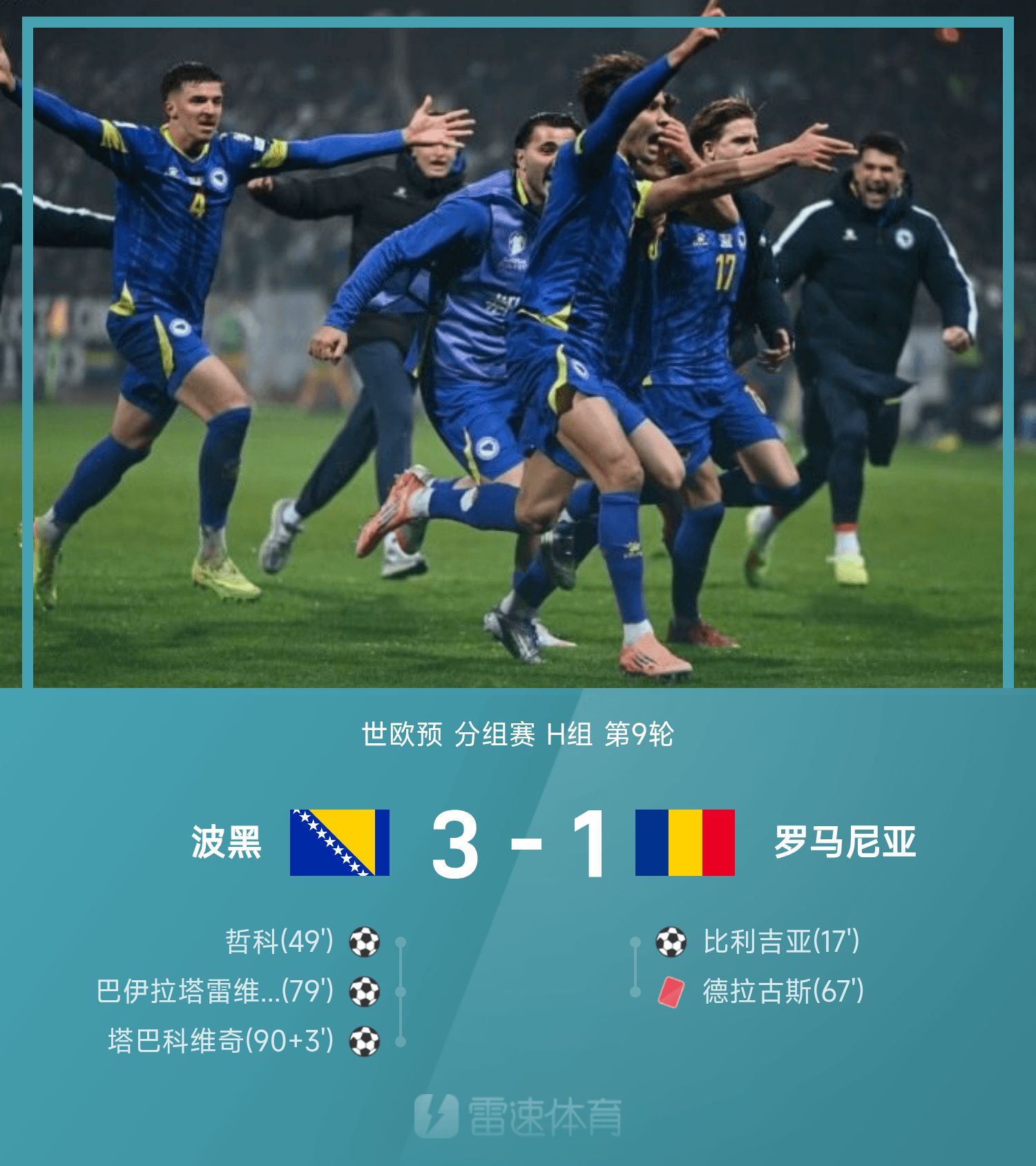 6686体育app11月16日讯 26赛季世欧预分组赛H组第9轮,波黑坐镇主队场迎战罗马尼亚。上半场,罗马尼亚梦幻开局,比利吉亚破门建功。下半场,波黑开端发力,哲科破守门员赛果分扳平。德拉古斯上场两分球钟严重违例染红罚下,罗马尼亚十人应战波黑。第79分钟,巴伊拉塔雷维奇世界波破门逆转局,塔巴科维奇破门锁定战局。比利吉亚破门难救主。最终,波黑3-1战胜十人罗马尼亚。