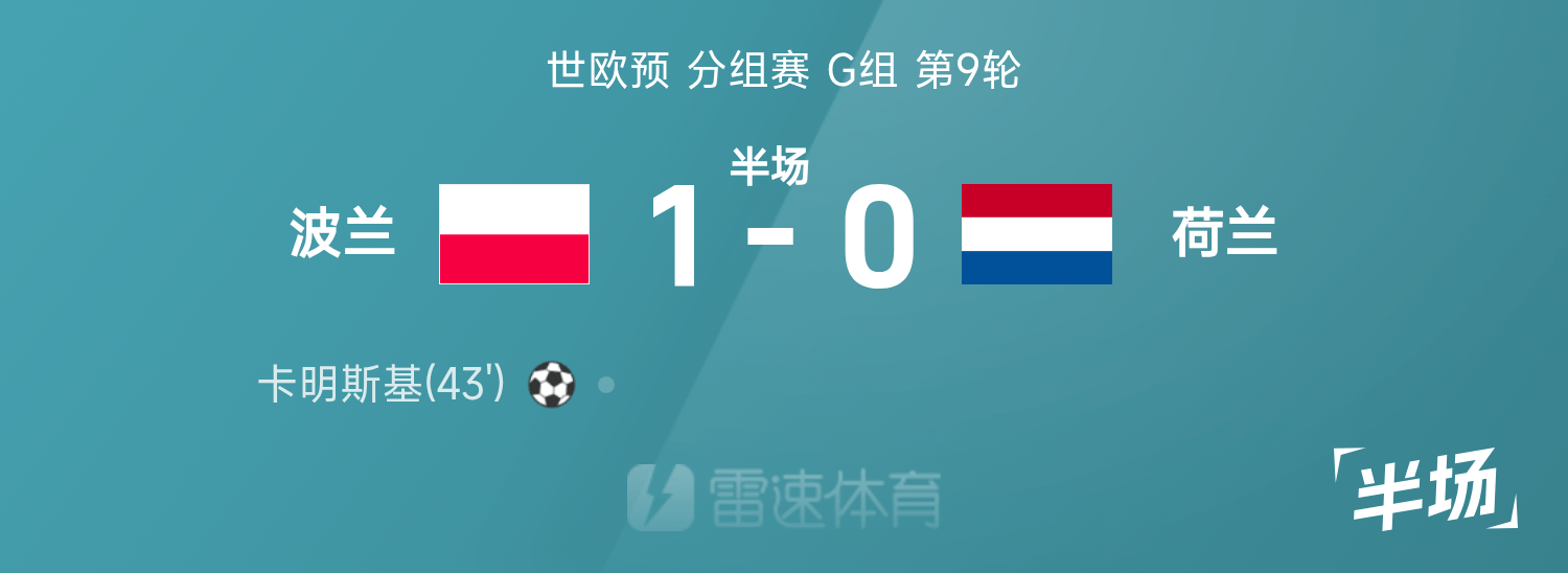 世欧预半场:卡明斯基单刀推远角破门,波兰暂1-0荷兰
