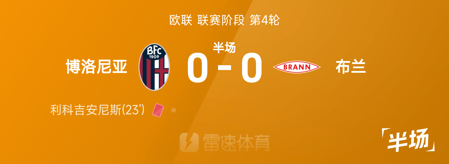 欧联半场:利科吉安尼斯意外染红,十人博洛尼亚暂0-0布兰