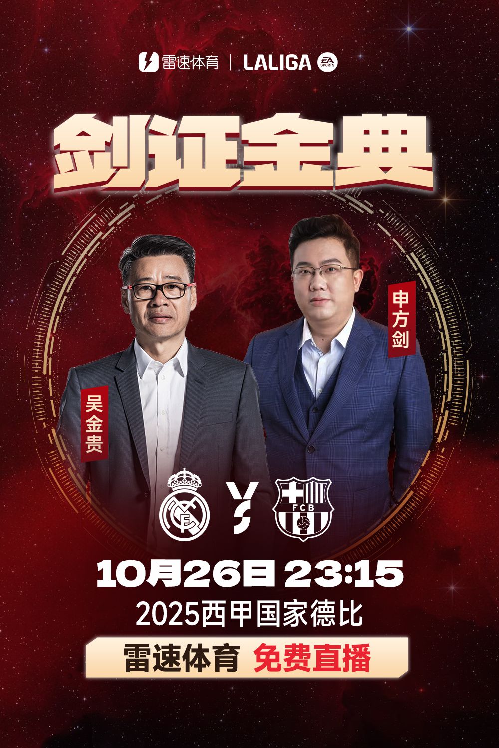 北京时间10月26日23:15,西甲第10轮,皇家马德里将在主队场迎战巴塞罗那,这将是本赛季首次西班牙国家德比。6686体育app将免费视频直播这场焦点对决,并非常荣幸地邀请到了两位特殊嘉宾担任本场竞赛的解说,分别为知名教练员吴金贵以及著名解说员申方剑。