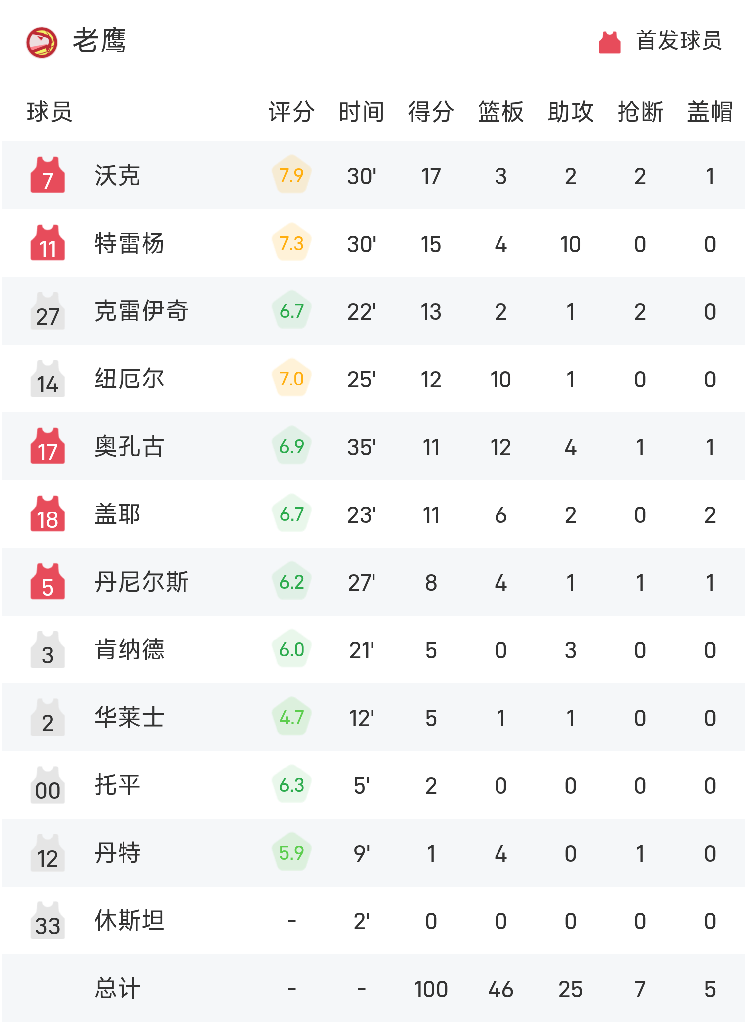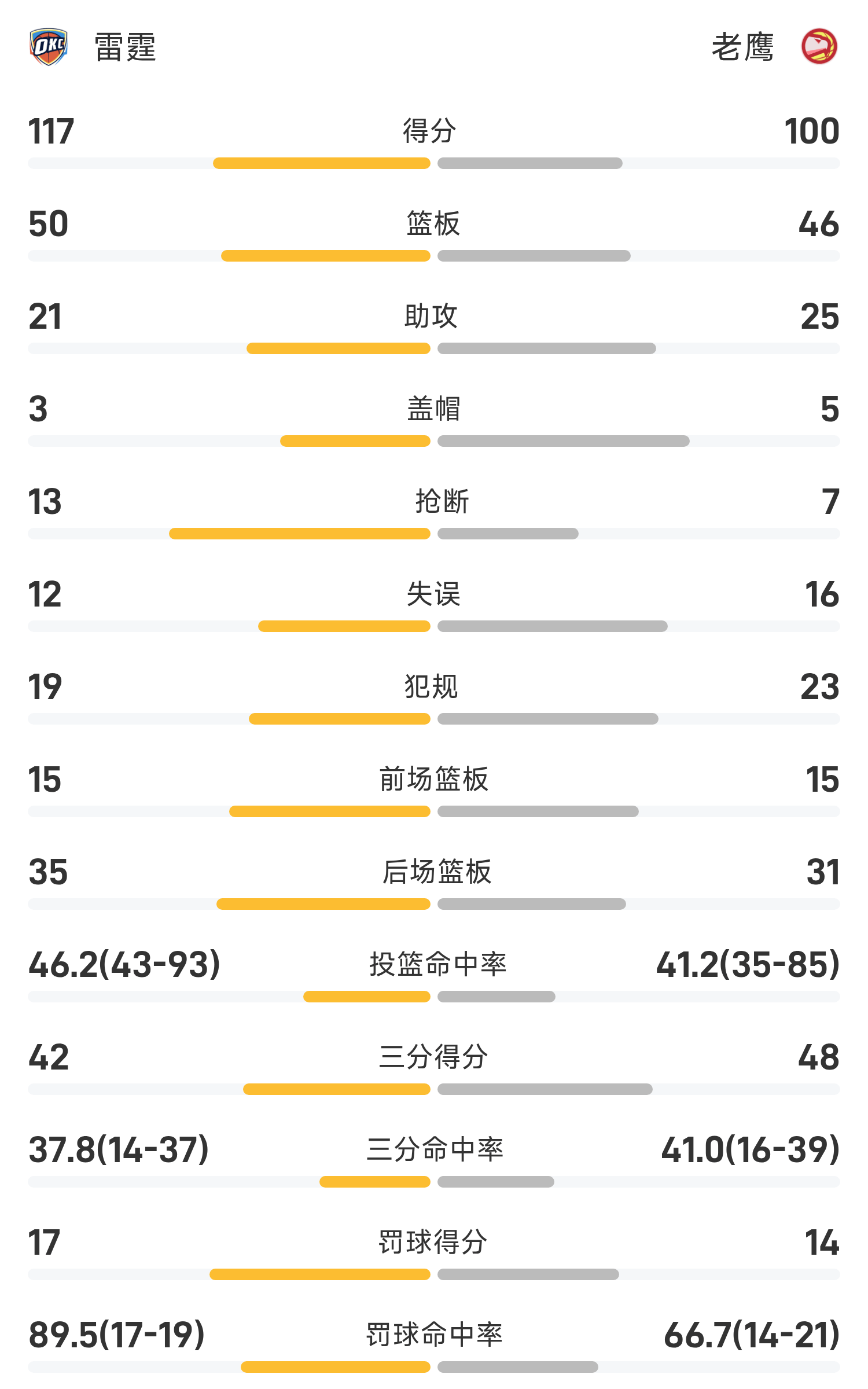 双方全场战罢,老鹰99-117不敌雷霆。
