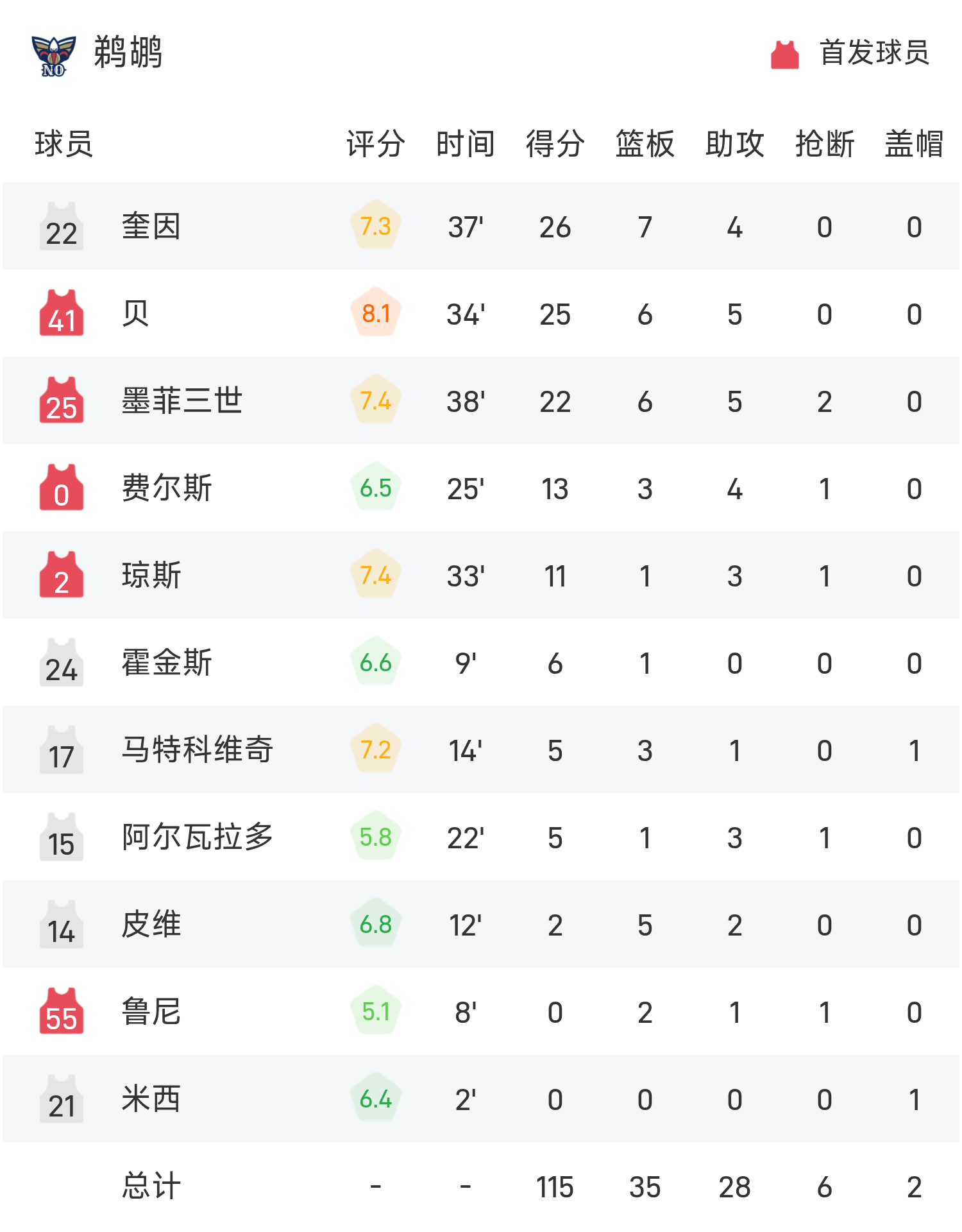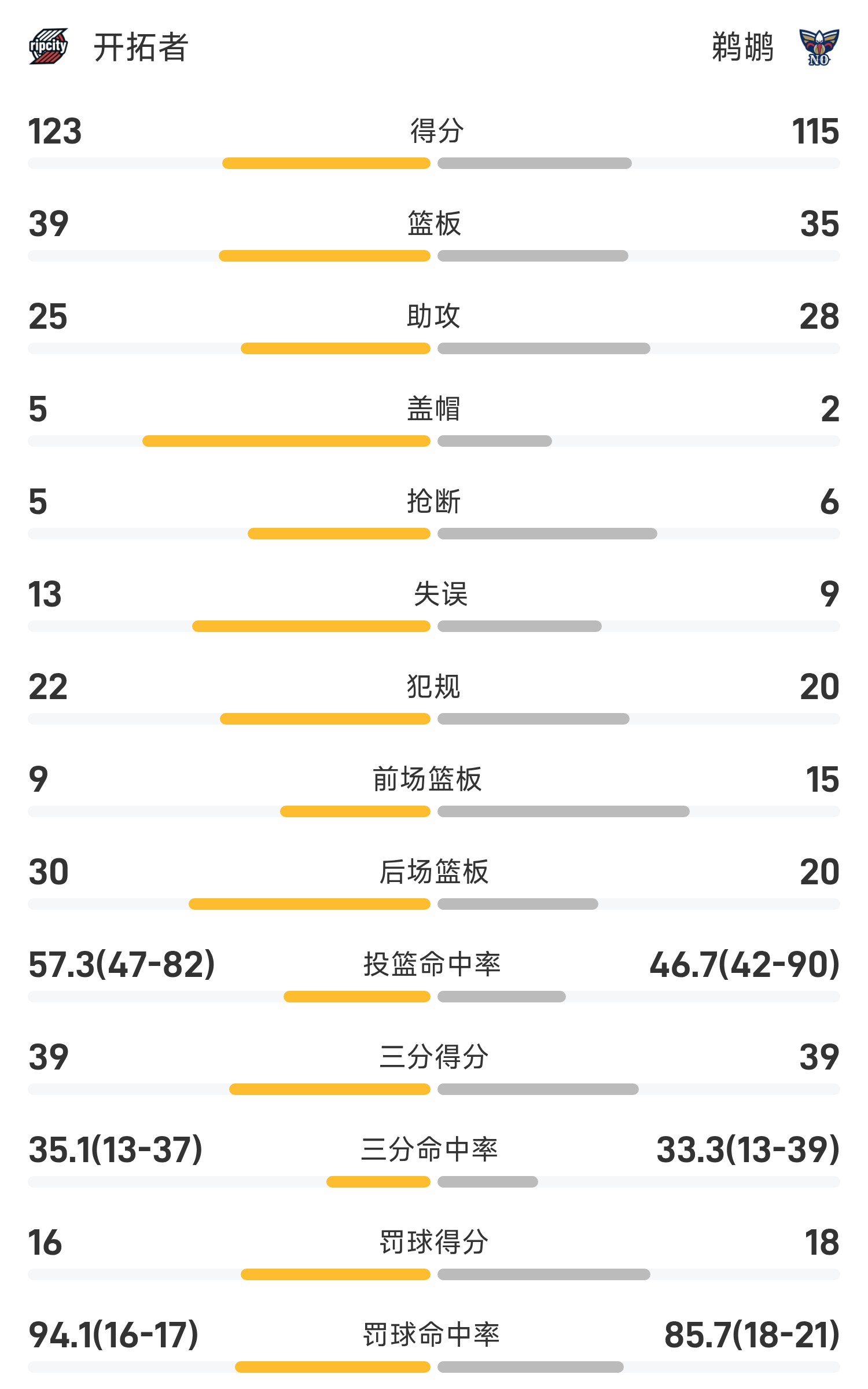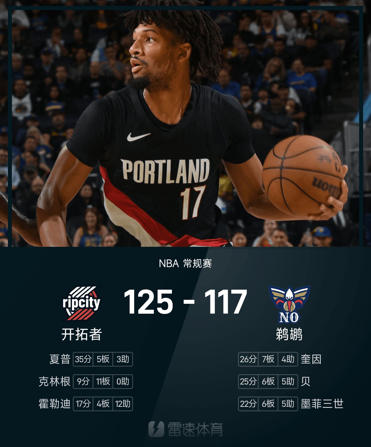 6686体育app11月13日讯 25/26赛季NBA 常规赛,鹈鹕对阵开拓者。双方全场战罢,鹈鹕117-125不敌开拓者。夏普砍下全场最高的35分5板3助,率领开拓者胜利取胜。