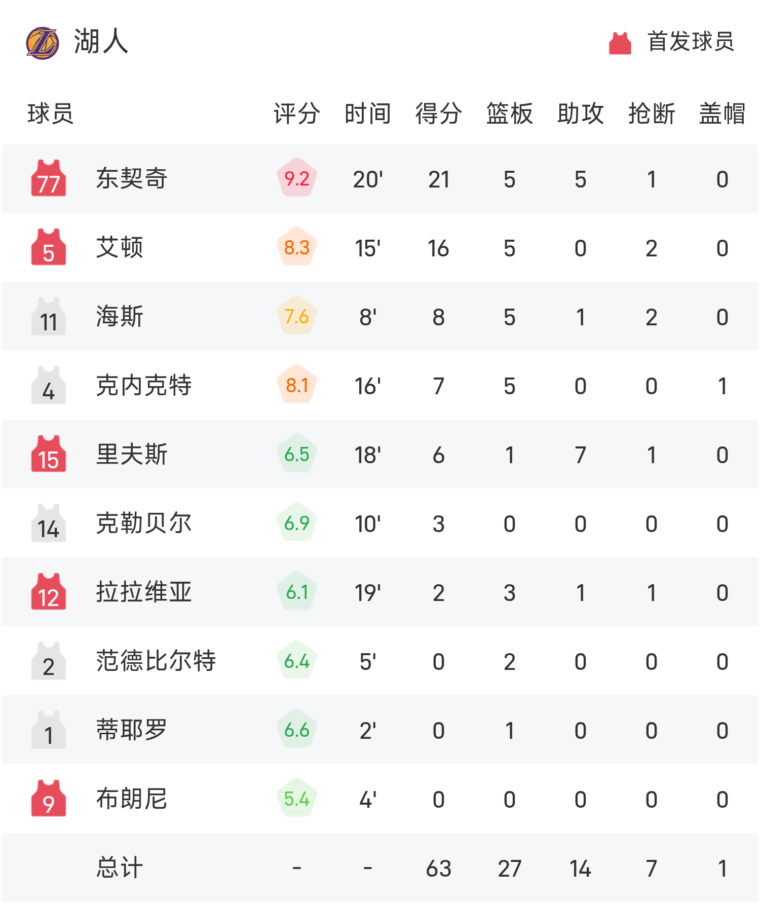 NBA半场:东契奇21分,雄鹿8分半合砍5分,湖人63-34雄鹿