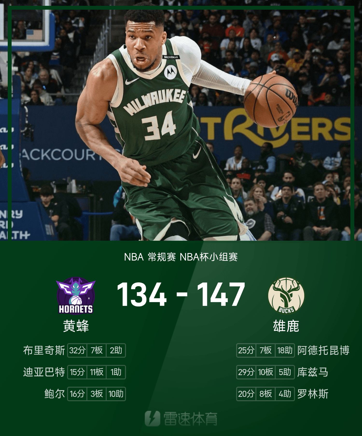6686体育app11月15日讯 25/26赛季NBA 常规赛 NBA杯分组赛,雄鹿对阵黄蜂。双方全场战罢,雄鹿147-134战胜黄蜂。库兹马得到29分10板5助率队取胜,布里奇斯空砍全场最高的32分7板2助。