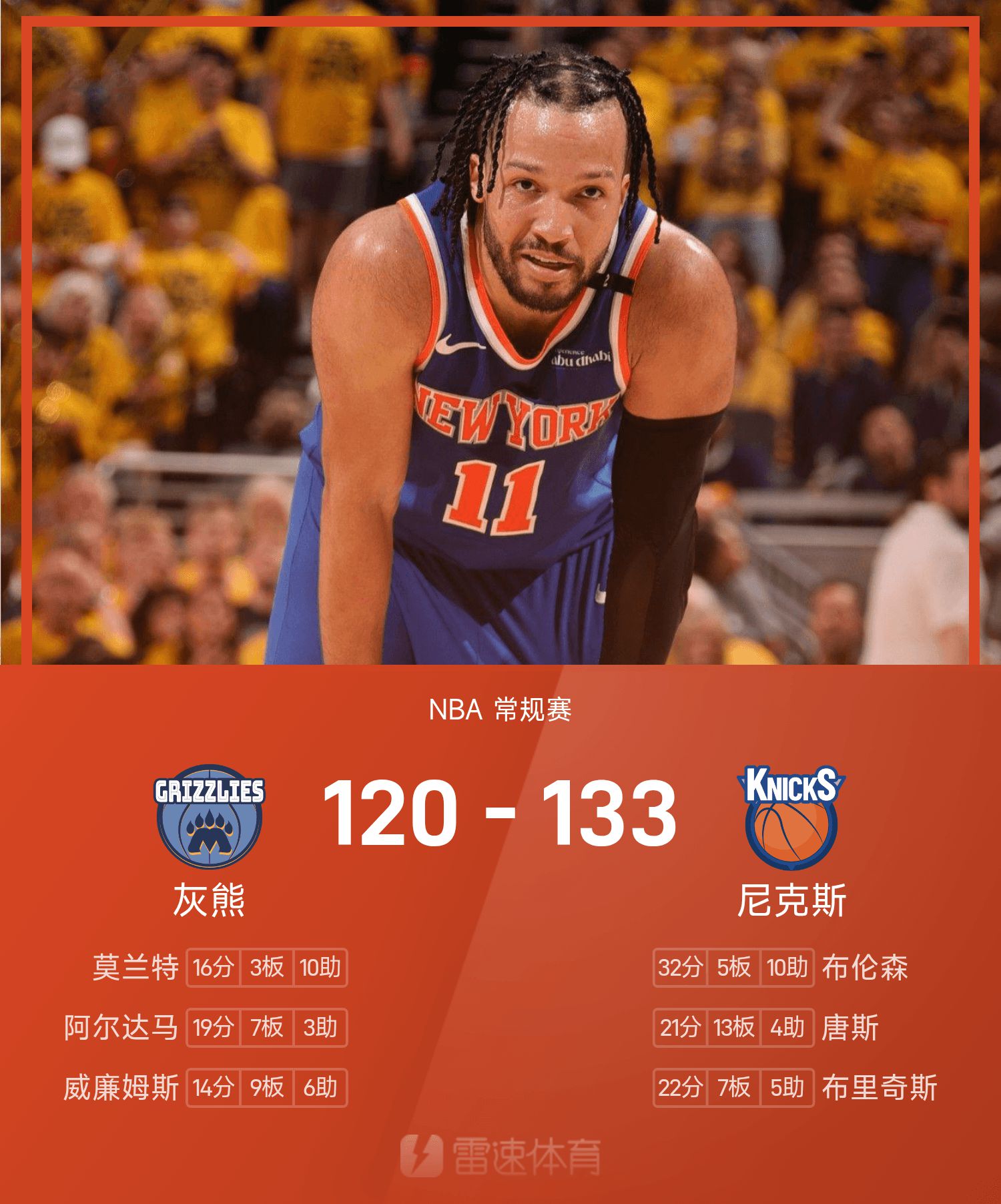布伦森砍32分10助攻,率领尼克斯主队场豪取7连胜。