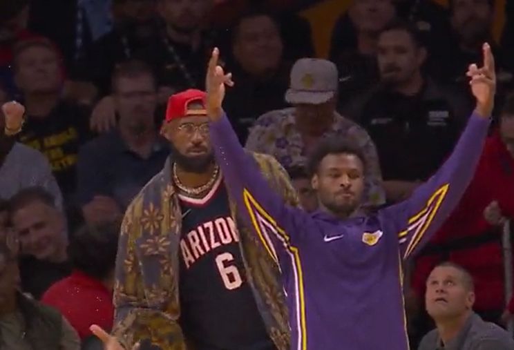 斯玛特命中三分球扳平局赛果分时,詹姆斯和布朗尼一起在场边庆祝。